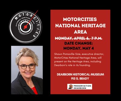 On Monday, May 4, Shawn Pomaville-Size, executive director, MotorCities National Heritage Area, will give an overview presentation of the MotorCities National Heritage Area that will cover the founding of the MotorCities National Heritage Area, Dearborn’s role in that founding, a description of the national heritage area program within the National Park Service, the MotorCities’ scope, impact, and role as grant funder, as well as a discussion of the activities of MotorCities over its 28 years.
